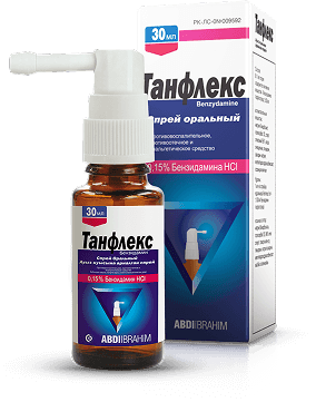 Для облегчения боли в горле применяются антисептические и противовоспалительные препараты местного действия, такие как Танфлекс® спрей, который оказывает антисептическое и обезболивающее действие, убирая воспаление и уменьшая болевые ощущения. Спрей легко наносится непосредственно на поражённую область, что позволяет быстрее снять раздражение и подавить рост бактерий или вирусов.